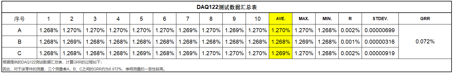 Untuk memastikan bahawa kad pemerolehan data yang dipilih memenuhi keperluan, pasukan ME telah mengujinya. Analisis menunjukkan bahawa kad pemerolehan data yang dipilih mempunyai kestabilan yang sangat baik, dengan GRR kira-kira 0.072% antara tiga pengukur A, B dan C.