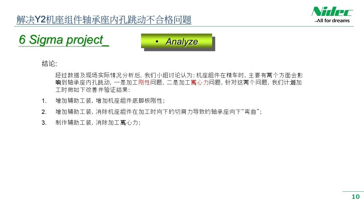 Proses penambahbaikan DMAIC merangkumi lima fasa: menentukan, mengukur, menganalisis, memperbaiki, dan mengawal. Lima fasa ini merupakan kaedah peningkatan kualiti proses penuh, dan setiap fasa terdiri daripada beberapa langkah kerja. Berikut adalah penerangan ringkas tentang peningkatan masalah bahawa kebocoran ruang galas depan dan belakang dan runout muka akhir perhimpunan tidak stabil selepas pemasangan pangkalan mesin dua yang disokong dan perhimpunan ruang galas: