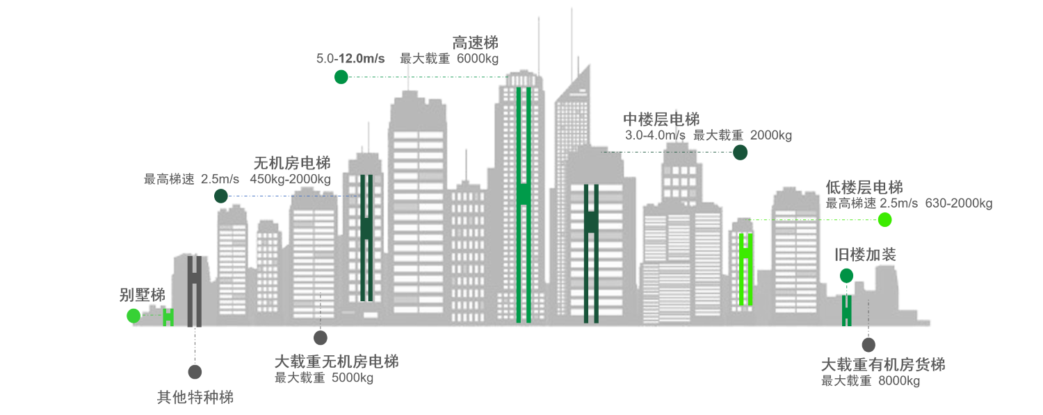 Kami menawarkan pelbagai jenis mesin cengkaman dan kerangka utama yang sepadan, sesuai untuk senario aplikasi dengan kapasiti beban maksimum 6000kg (nisbah 2:1) dan kelajuan maksimum 12m/s (nisbah 1:1). Pelanggan boleh terus memilih model yang sesuai berdasarkan parameter lif, dengan ketara memendekkan kitaran reka bentuk.
